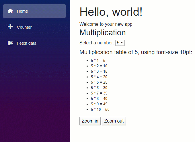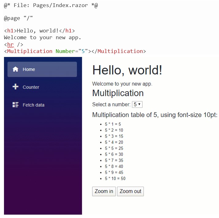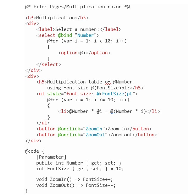 A continuación, veamos el código del componente <Multiplication>, definido en el archivo Multiplication.razor